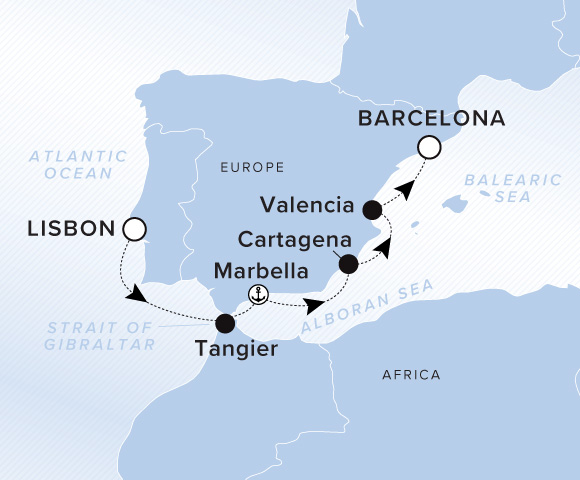 Travel the Iberian Peninsula and cross continents over six nights. Leave Lisbon with a day at sea before Tangier, where souks, spices and Kasbah walls overlook the Strait of Gibraltar. Continue to Marbella, where orange trees perfume the air around Plaza de los Naranjos, then to Cartagena with its Roman theater and modernist facades. Valencia—birthplace of paella and home to the Gothic Silk Exchange—follows. Barcelona, and its bustling markets, sunlit squares and modernist landmarks by the sea, crown the journey.