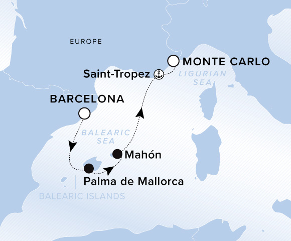 A map of Europe and the Balearic Sea. A line starts in Barcelona and goes to Palma de Mallorca, Mahon, Saint-Tropez, and ends in Monte Carlo.