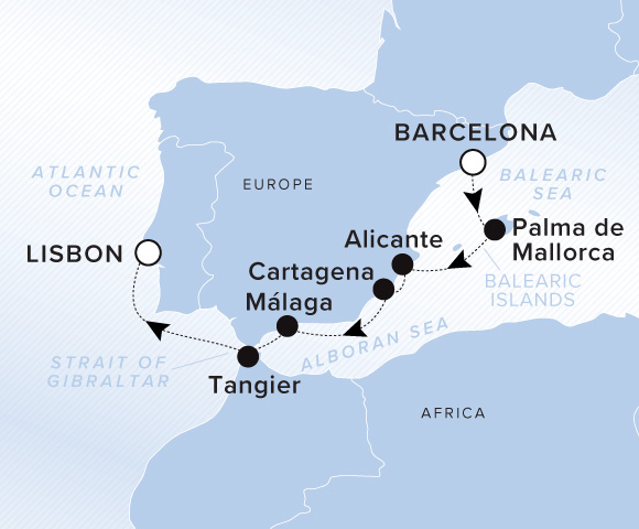 Embrace the soul of España along its Mediterranean coast. Leaving Barcelona, discover Palma’s soaring cathedral, Alicante’s Castillo de Santa Bárbara, and Cartagena’s 2,000-year-old teatro romano. In Málaga, birthplace of Picasso, explore the Alcazaba and linger into the Andalusian evening with a late departure. Following a final call in Tangier to get lost in the labyrinthine medina, you’ll sail for Lisbon, where tiled façades climb the hills above the Tagus.
