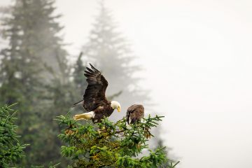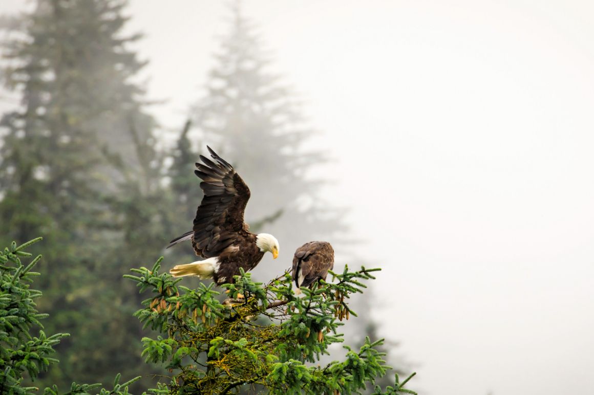 An eagle lands atop a tall tree.