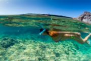 Woman snorkeling underwater in the ocean.