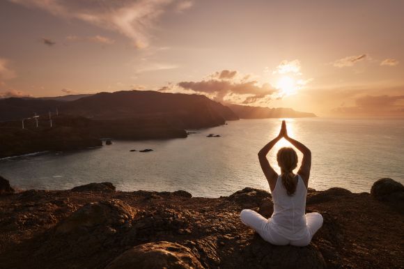 Woman doing yoga on a cliff during sunrise.