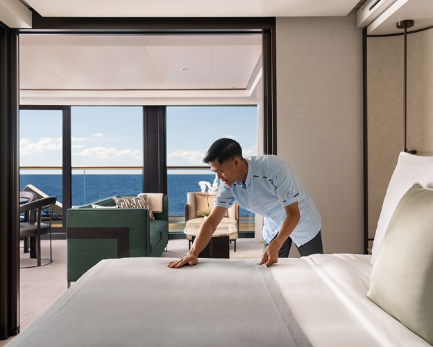 Every suite features an ocean-view terrace, an espresso machine, and a mini-bar replenished daily with your preferred beverages.