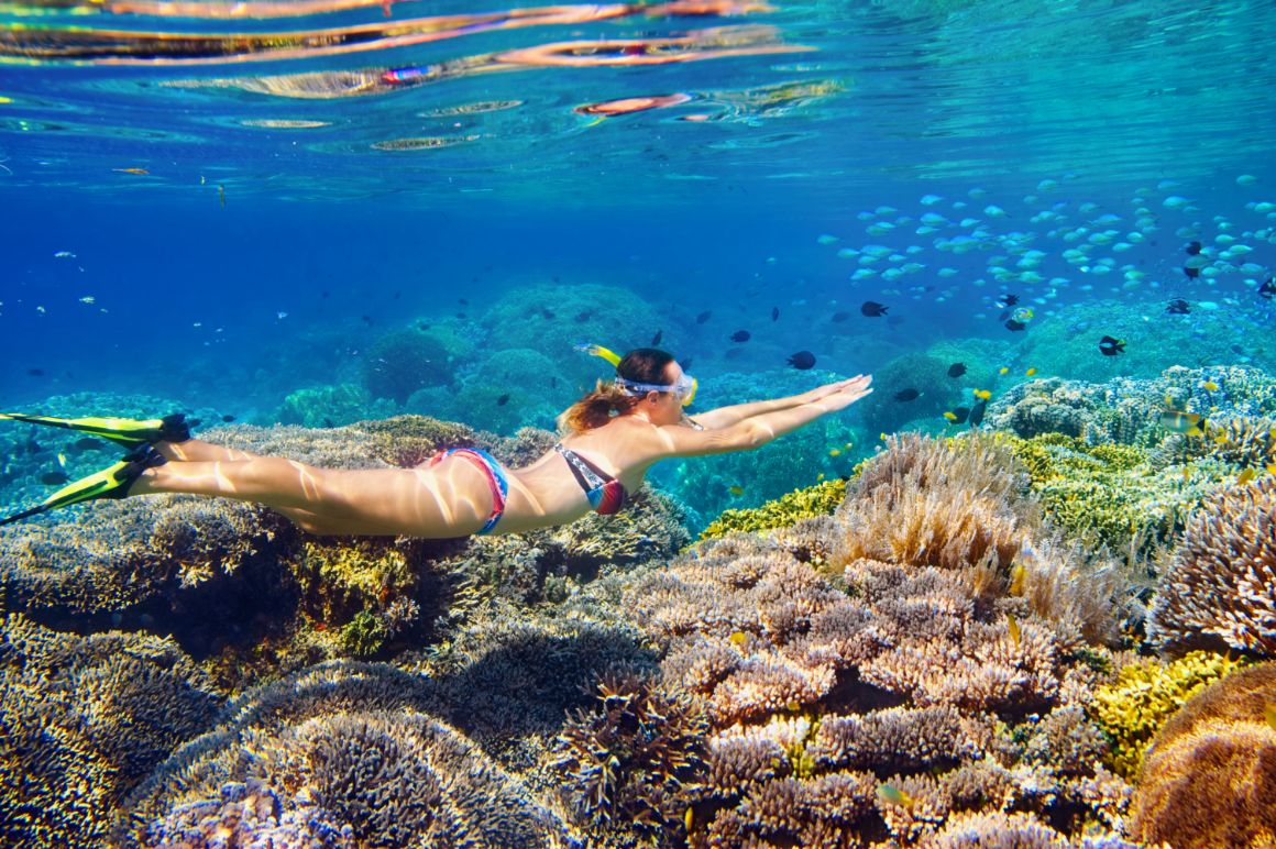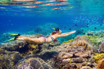 Woman snorkeling underwater in the ocean.