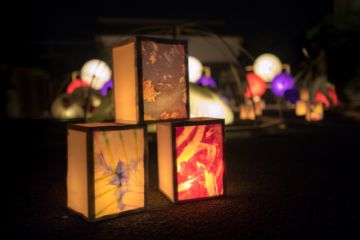 Lanterns glowing in the dark.
