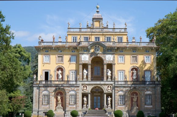 The multicolored façade of a Renaissance-style villa decorated with balconies and statues.