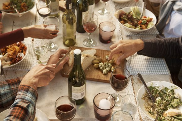 A table full of typical Mediterranean food with people who cut bread and take olive oil.