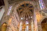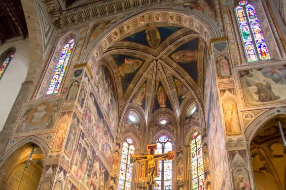 The interior of a Renaissance church with high ceilings adorned with intricate paintings.