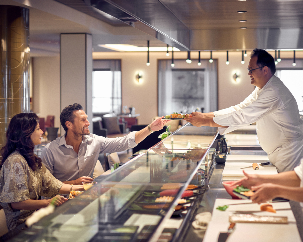 Chef handing food to customer sitting at the bar.