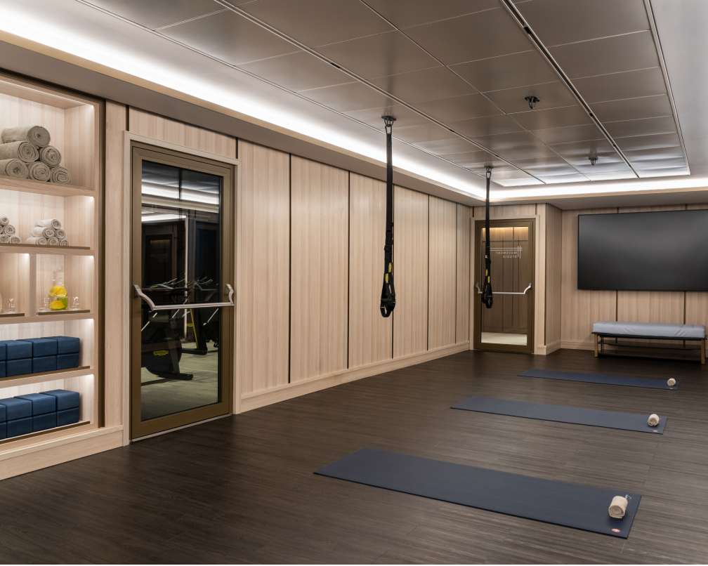 The Fitness Studio offers a holistic approach to wellbeing, with personalized guidance, movement-focused programming and optional lectures that support a healthy voyage. A selection of Technogym equipment enables familiar routines or new forms of exercise, all within a calm, contemporary setting designed for strengthening, stretching and reconnecting with the body.