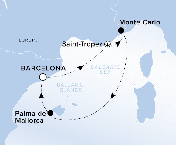 Embarking in Barcelona, Luminara sails for Saint-Tropez, where the citadel provides stunning views of the harbor. Then glamour takes center stage in Monte Carlo in the Belle Époque architecture of the famous casino and in Monaco Cathedral, where Grace Kelly married Prince Rainier. Palma de Mallorca is likewise home to impressive cathedrals and palaces, as well as lovely beaches.