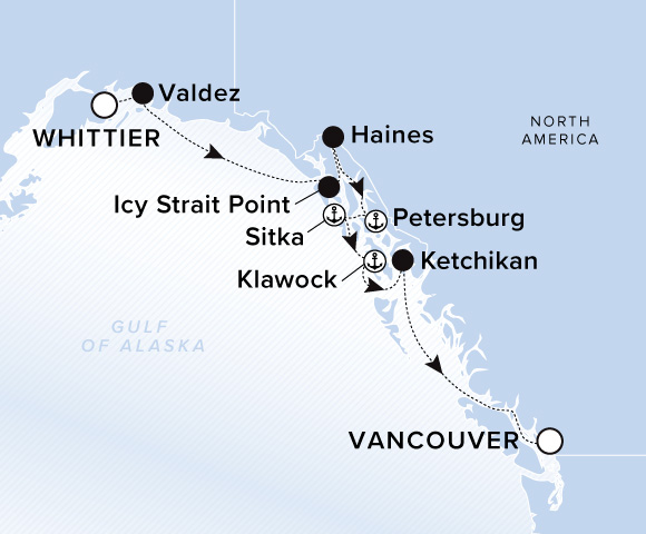 A map of the Gulf of Alaska. A line starts in Whittier and goes to Valdez, Icy Strait Point, Haines, Petersburg, Sitka, Klawock, Ketchikan, and ends in Vancouver.