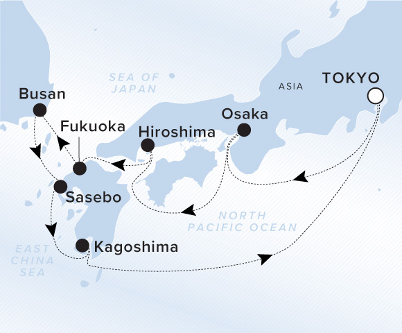 A map of Asia, the Pacific Ocean, the East China Sea, and the Sea of Japan. A line starts in Tokyo and goes to Osaka, Hiroshima, Fukuoka, Busan, Nagasaki, Kagoshima, and ends back in Tokyo.