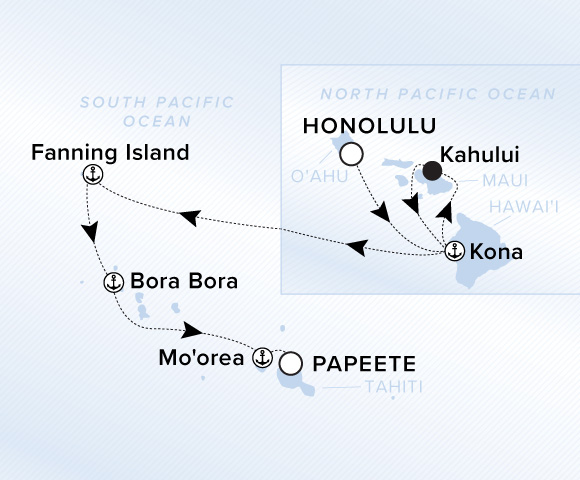 A map of the Pacific Ocean. A line starts in Honolulu and goes to Kona, Kahului, Fanning Island, Bora Bora, Moorea, and ends in Papeete.