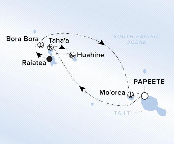 A map of the Pacific Ocean. A line starts in Papeete and goes to Taha'a, Huahine, Raiatea, Bora Bora, Mo'orea, and ends back in Papeete.