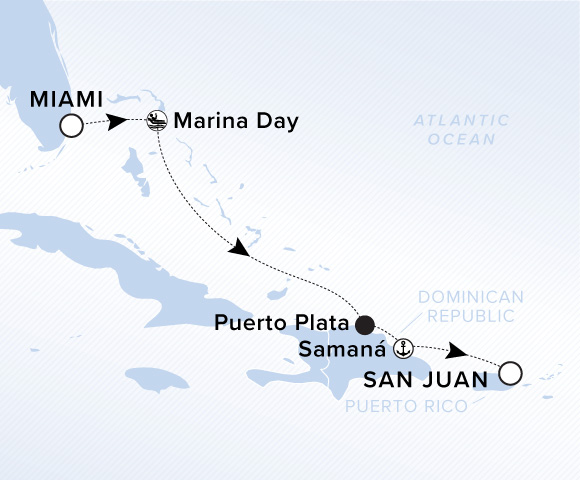 A map of the Caribbean Sea and Atlantic Ocean. A line starts in San Juan and goes to Marina Day, Puerto Plata, Samana, and ends in San Juan.