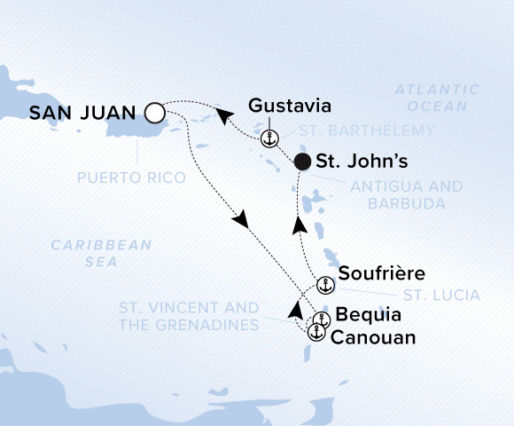 A map of the Caribbean Sea and Atlantic Ocean. A line starts in San Juan and goes to Bequia, Canouan, Soufriere, St. John's, Gustavia, and then back to San Juan.