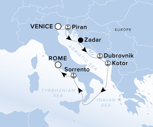 Bookended by gondolas and gladiators, this sailing shows the best of the Adriatic in one wonderful week. Begin in Venice, a city of canals and palaces, before hugging the coast south to Piran in Slovenia, then Zadar, two breathtaking ports on the Adriatic coast. Stay late in Dubrovnik and discover the city after dark. Sail the stunning Bay of Kotor, spend a day at sea, then arrive in Sorrento, where citrus groves, cliffside cafés, and views of Capri await before disembarking in Rome.