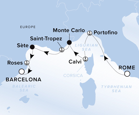Framed by three Mediterranean countries and one glittering principality, this voyage traces the best of Europe’s southern coast. Depart Rome’s ancient grandeur for Portofino’s sweeping pastel harbor before anchoring in Calvi, Corsica. Enjoy late departures in Monte Carlo and Saint-Tropez before a call in Sète, a quintessentially French port of canals, fishing boats and art studios. Sail on to Roses in Spain before ending in Barcelona, Gaudí’s city of Gothic streets.