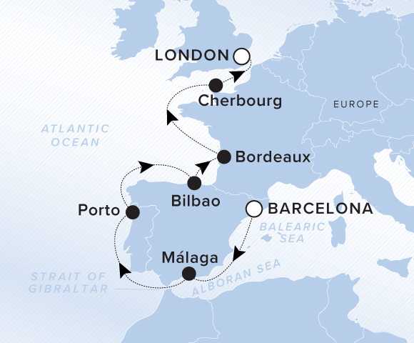 Departing from Barcelona, begin with a sea day along Spain’s coast to Málaga, gateway to the Alhambra. Enjoy more sailing time, then call at Porto, where the city’s namesake wine flows from cellars along the Douro. Another sea day leads to Bilbao and the galleries of contemporary art at the Guggenheim Museum. Enjoy an overnight in Bordeaux, with plenty of time to explore its vineyards and elegant squares, followed by a day to explore Cherbourg on Normandy’s coast. Finish the voyage in Tilbury on the River Thames, just east of London.