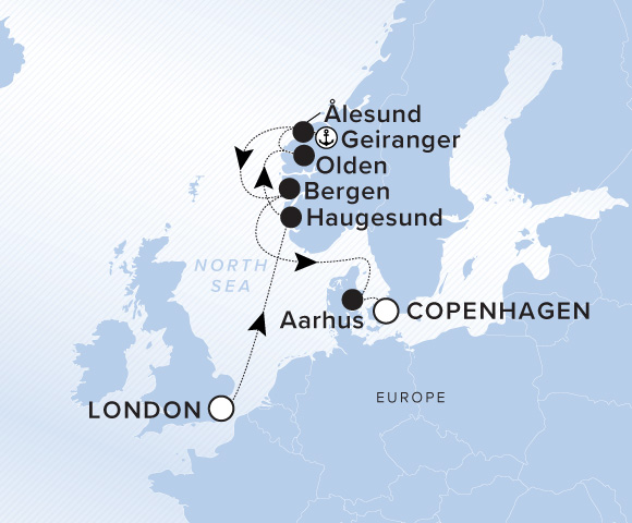 Sail from London to Norway's legendary fjords, where natural drama takes center stage. Begin in Haugesund, gateway to the Hardangerfjord region, then cruise to Olden, nestled deep within Nordfjord. Continue to Ă…lesund with its remarkable Art Nouveau architecture, before entering Geirangerfjord, a UNESCO wonder of cascading waterfalls and sheer cliffs. Explore the historic heart of fjord country in Bergen, then sail to Denmark for Aarhus's striking modern art scene. Conclude your odyssey in Copenhagen, Scandinavia's celebrated capital of design and culture.