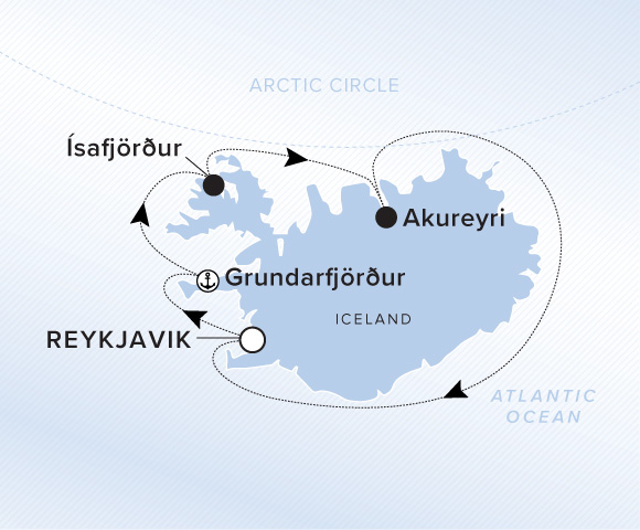 Make the most of Iceland’s long summer light on this circumnavigation of the north. From Reykjavik, sail to Grundarfjörður, where the perfect cone of Kirkjufell rises above the bay. Continue to Ísafjörður, set deep within the Westfjords, then Akureyri, gateway to geothermal pools and volcanic landscapes. Cross the Arctic Circle before returning to Reykjavik, where glaciers, geysers, and a final northern sunset are waiting.