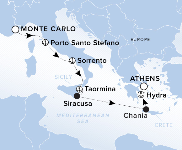 A map of Europe and the Mediterranean Sea. A line starts in Monte Carlo and goes to Porto Santo Stefano, Sorrento, Taormina, Siracusa, Chania, Hydra, and ends in Athens.