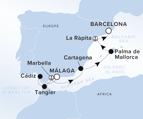 Sail to Cádiz, a 3,000-year-old port city where La Caleta Beach rests between two ancient castles. Continue to Tangier, once a haven for artists including Tennessee Williams and Henri Matisse, before returning to Spain for Marbella’s shores. In Cartagena, a Roman theater from the age of Augustus stands at the city’s heart, followed by Palma de Mallorca, La Ràpita, and Barcelona.
