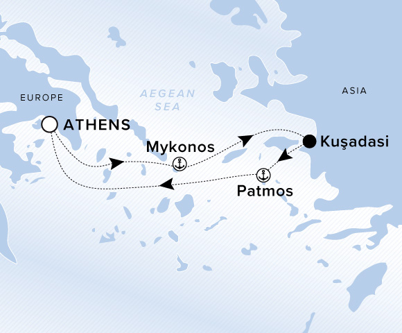 A map of Europe and Asia. A line starts in Athens and goes to Mykonos, Kusadasi, Patmos, and ends back in Athens.