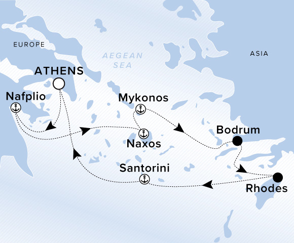 A map of Europe. A line starts in Athens and goes to Nafplio, Naxos, Mykonos, Bodrum, Rhodes, Santorini, and ends back in Athens.