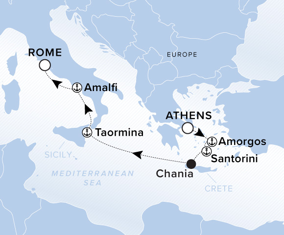 A map of Europe. A line starts in Athens and goes to Amorgos, Santorini, Chania, Taormina, Amalfi, and ends in Rome.