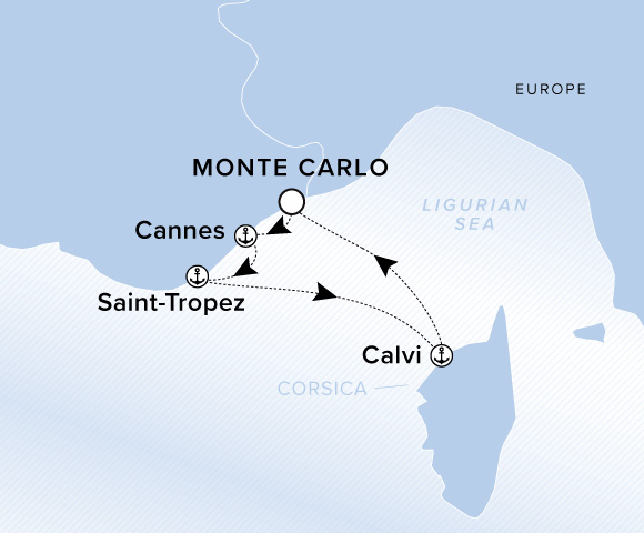 A map of Europe. A line starts in Monte Carlo and goes to Cannes, Saint-Tropez, Calvi, and ends back in Monte Carlo.