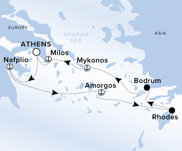 A map of Europe and Asia. A line starts in Athens and goes to Nafplio, Amorgos, Rhodes, Bodrum, Mykonos, Milos, and ends back in Athens.