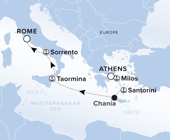 A map of Europe. A line starts in Athens and goes to Milos, Santorini, Chania, Taormina, Sorrento, and ends in Rome.