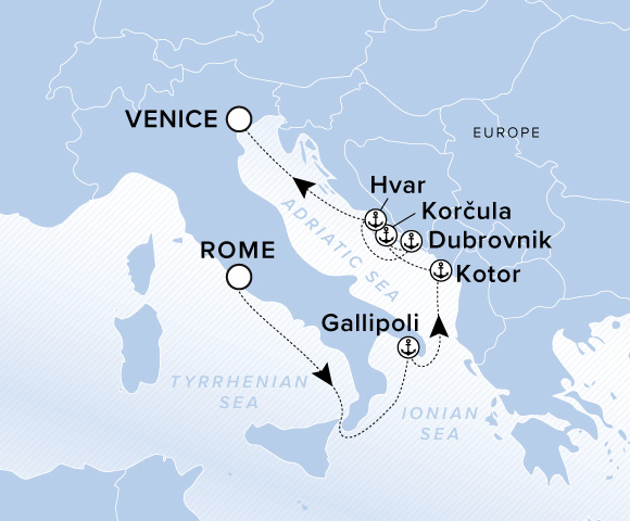 A map of Europe. A line starts in Rome and goes to Gallipoli, Kotor, Dubrovnik, Korcula, Hvar, and ends in Venice.