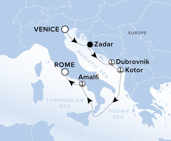 A map of Europe. A line starts in Venice and goes to Zadar, Dubrovnik, Kotor, Amalfi, and ends in Rome.
