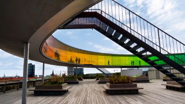 A set of stairs leads to a colorful walkway in Aarhus, Denmark.