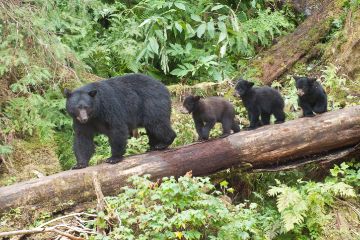 A mother bear and three cubs walk across a log surrounded by greenery.
