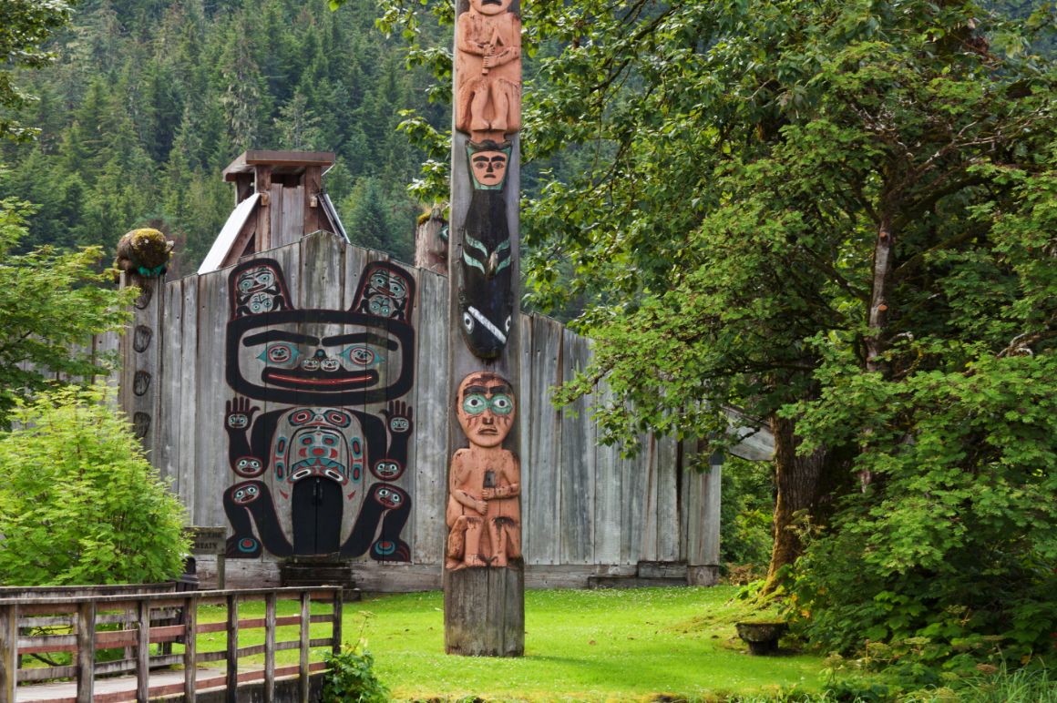 A totem sits in a forested area.