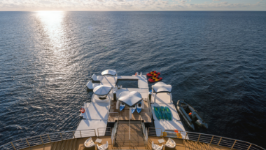 When the yacht drops anchor off the Abaco Islands, head aft to the Marina for a day on the turquoise waters in the warmth of the Bahamian sun. The yacht’s custom platforms transform into Marina Beach, a resort on the water with loungers, an ocean pool, and easy access for watersports. Go kayaking or paddleboarding from the yacht, jump in for a swim, or simply relax on a chaise and sip a craft cocktail while taking in panoramic views of the sea and shore.