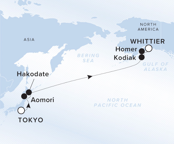 A map of Japan, the Pacific Ocean, and Alaska. A line starts in Tokyo and goes to Aomori, Hakodate, Kodiak, Homer, and ends in Whittier.