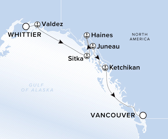 A map of the Gulf of Alaska. A line starts in Whittier and goes to Valdez, Sitka, Haines, Juneau, Ketchikan, and ends in Vancouver.