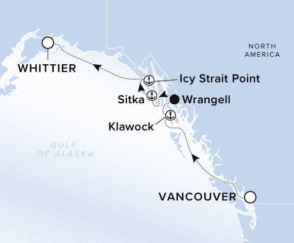 A map of the Gulf of Alaska. A line starts in Vancouver and goes to Klawock, Wrangell, Sitka, Icy Strait Point, and ends in Whittier.