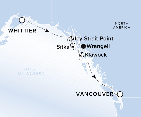 A map of the Gulf of Alaska. A line starts in Whittier and goes to Icy Strait Point, Sitka, Wrangell, Klawock, and ends in Vancouver.