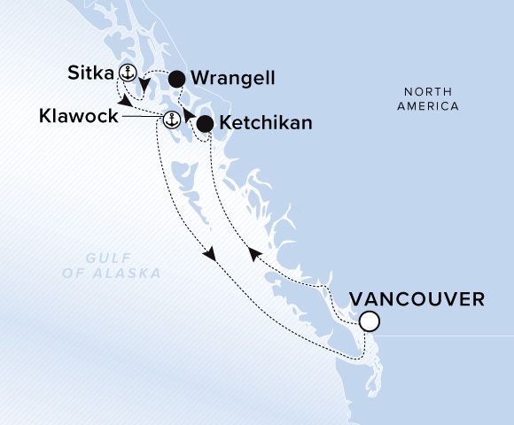 A map of the Gulf of Alaska. A line starts in Vancouver and goes to Ketchikan, Wrangell, Sitka, and ends in Klawock.