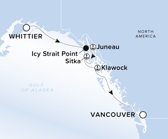 A map of the Gulf of Alaska. A line starts in Whittier and goes to Icy Strait Point, Juneau, Sitka, Klawock, and ends in Vancouver.