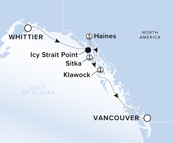 A map of the Gulf of Alaska. A line starts in Whittier and goes to Icy Strait Point, Haines, Sitka, Klawock, and ends in Vancouver.