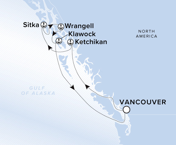 A map of the Gulf of Alaska. A line starts in Vancouver and goes to Ketchikan, Sitka, Wrangell, Klawock, and ends back in Vancouver.