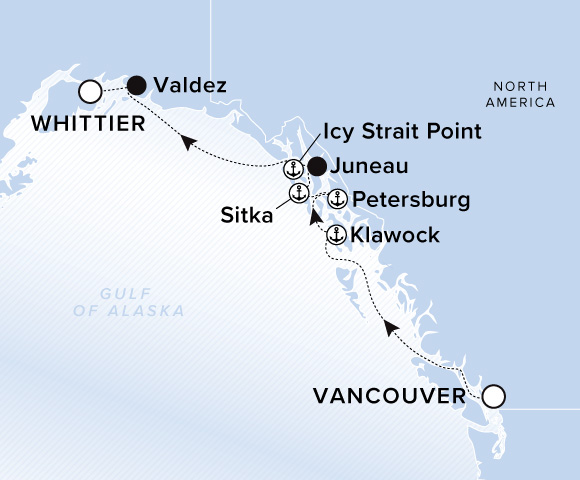 A map of the Gulf of Alaska. A line starts in Vancouver and goes to Klawock, Petersburg, Sitka, Juneau, Icy Strait Point, Valdez, and ends in Whittier.