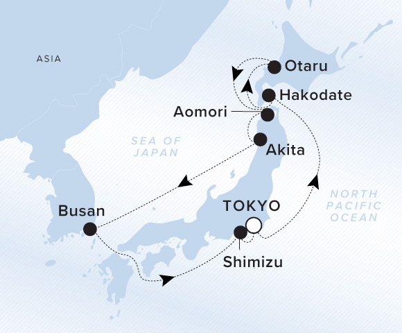 A map of Asia. A line starts in Tokyo and goes to Hakodate, Otaru, Aomori, Akita, Busan, Shimizu, and ends back in Tokyo.